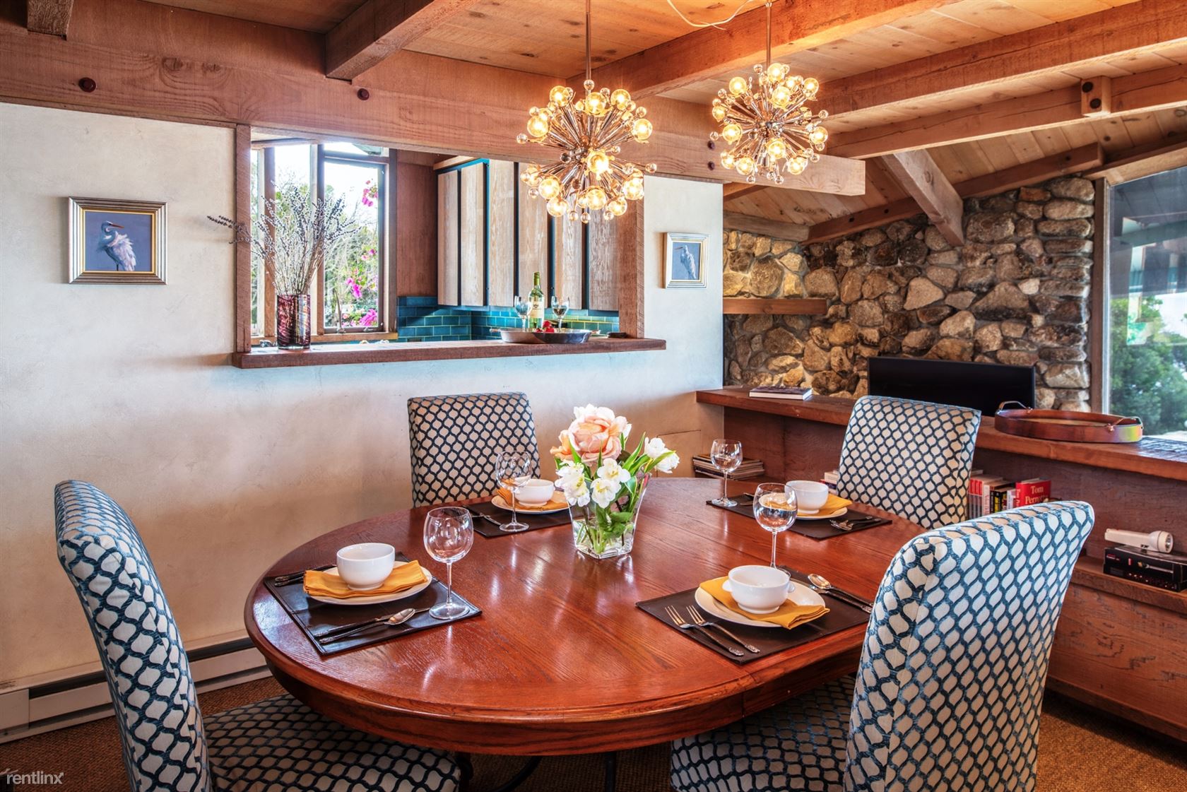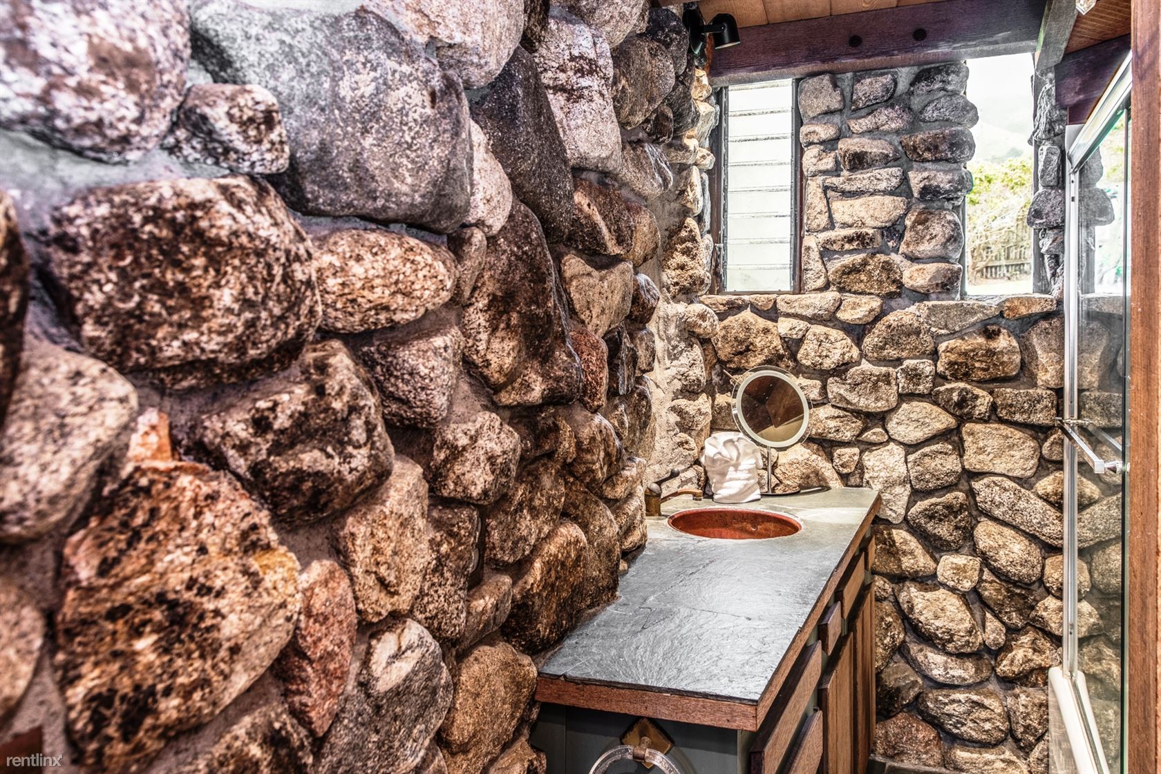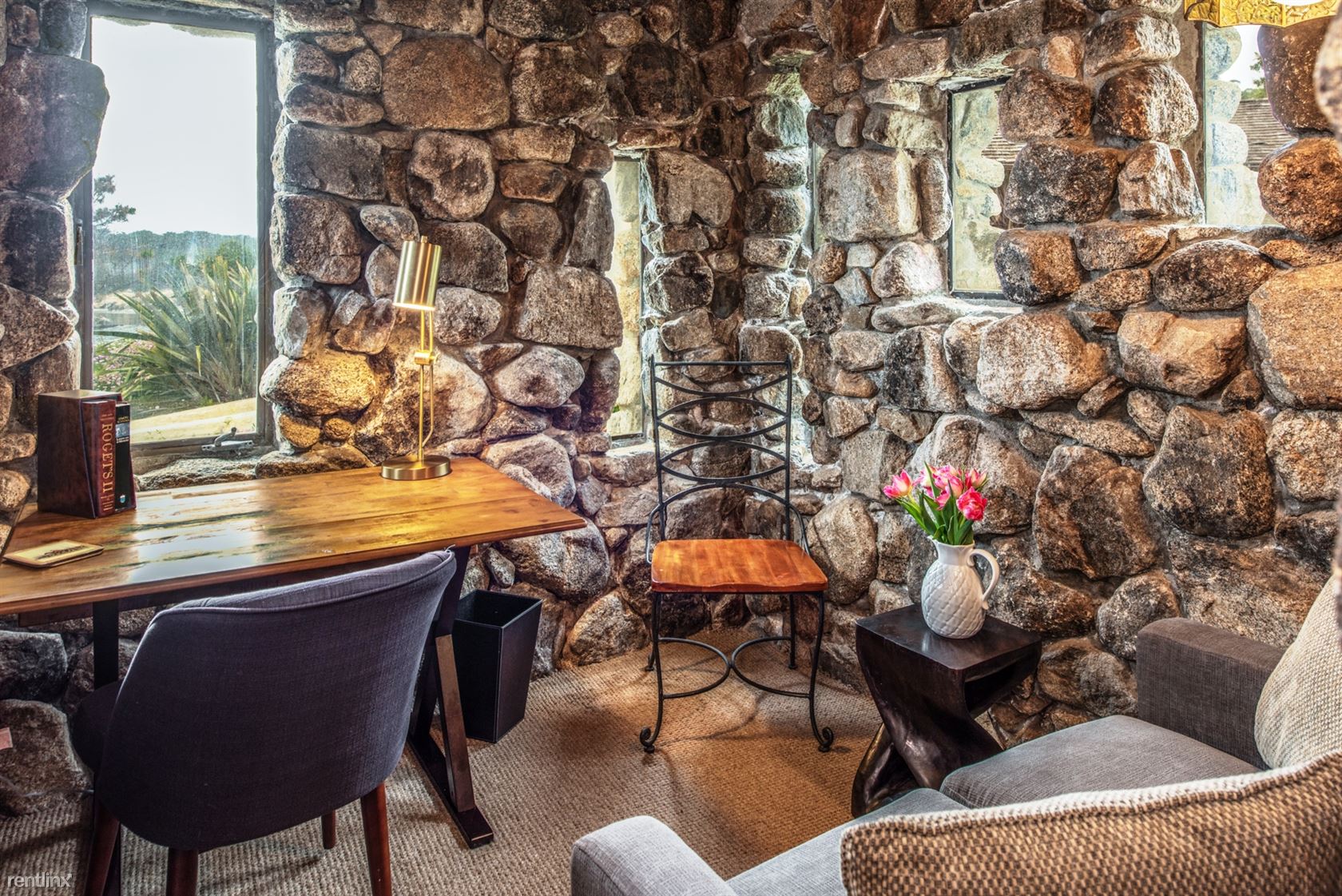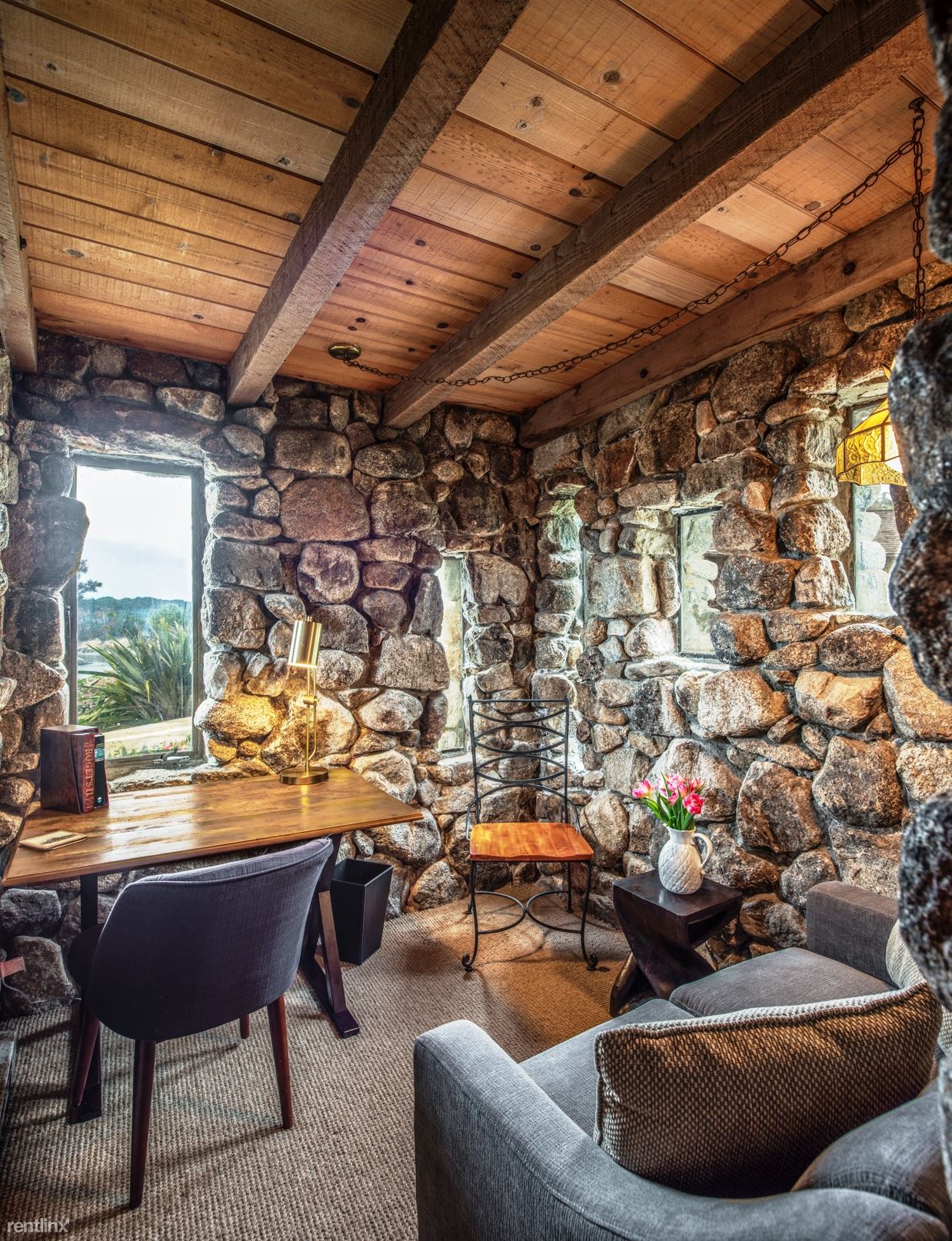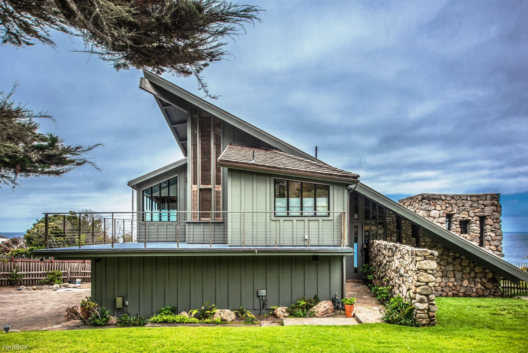 Flanked by windswept cypress trees and a small garden with bougainvillea, roses and hydrangea, the home includes intriguing mid century touches such as vintage pendant lighting, natural stone interior walls and stone steps inside the home. An oceanfront patio offers stone benches and a table, an ideal place to meditate or to watch whales and sunsets.